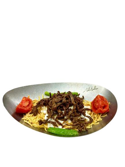 Çıtır patates üzerine yoğurt, domates, biber ızgara biftek dilimleri.