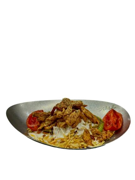 Çıtır patates üzerine yoğurt, domates, biber ızgara tavuk dilimleri.